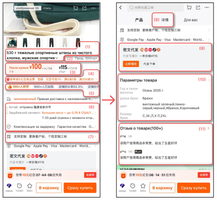 - (8) детали по товару (дополнительные фото, технические характеристики товара, размерный ряд и т.д.)
